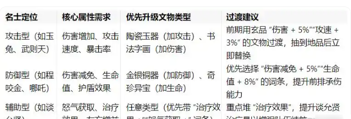每位名士可携带 4 件文物,文物分天、地、玄、黄 4 个品阶,仅地品、天品文物有 “特殊属性词条”,玄品、黄品仅作过渡,无需过多投入资源。