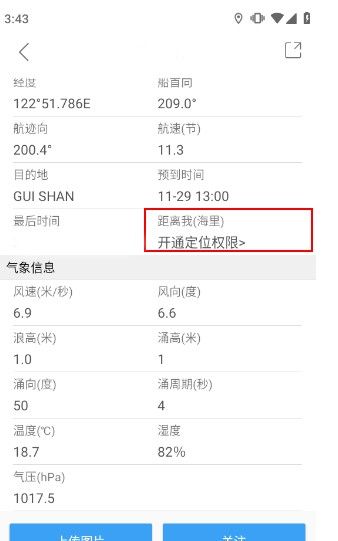 4、点击“信息”还可查看船只的航速、经纬度、目的地等各项微档案,用户还可以点击“距离我”实时监控与本地位置的距离,当然这需要用户注册并登录账号且开启定位权限。