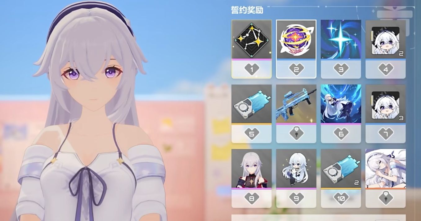 誓约礼物的获取方法比较多,各位可参与卡拉比丘的各项活动来获取,也能从礼品箱里开出来,但总体来说还是比较缺的,所以各位需做好送礼的规划,除非只想提升某一角色的好感,否则不要把所有礼物都送给她,只送加好感度高的即可。每次誓约等级提升后,都可解锁对应等级的誓约奖励,例如专属的个人剧情和誓约壁纸等,当誓约等级达到10级后,就能领完该角色的所有誓约奖励,各位可在誓约任务里查看每位角色在不同誓约等级下的奖励详情。