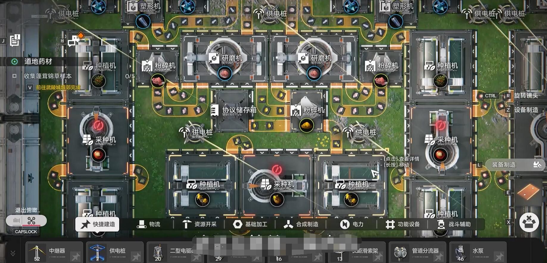 其实工厂由协议核心、生产线模块及电力系统这三大部分来组成的,其中的协议核心是中枢设施,黄色范围为供电区域,这个区域内能够建造精炼炉、粉碎机等设备。我们在最开始的时候解锁蓝图后,优先建造两条基础产线。首先就是推荐大家紫金矿→精炼炉→塑型机→灌装机(生产零件),种植机→粉碎机→罐装机(生产药品)。传送带的话其实是非常复杂的,这里就只介绍一下入门玩法就不太细说。但是基础上还是树形分布,有干线有分支,干线走原材料,越到后面的工序就越支线。主线带宽大于支线这样会避免材料堵路,精炼炉输出端连接3条传送带时,每条效率降至33%,建议重要物资单独走线。