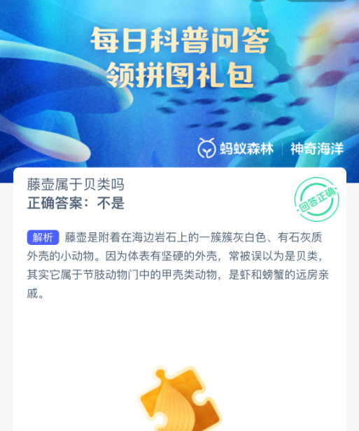 藤壶属于贝类吗?【神奇海洋】10月13日新题目已开答!正确答案现已公布,点击领取拼图,一起为修复海洋生态贡献力量!今日正确答案是:【不是】,藤壶是附着在海边岩石上的一簇簇灰白色、有石灰质外壳的小动物。