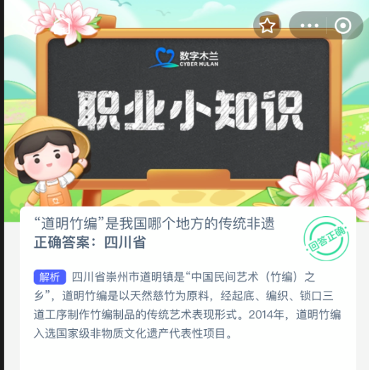 以上就是“道明竹编”是我国哪个地方的传统非遗?支付宝蚂蚁新村最新答案2025年10月13日,更多精彩内容,请点击关注更新!