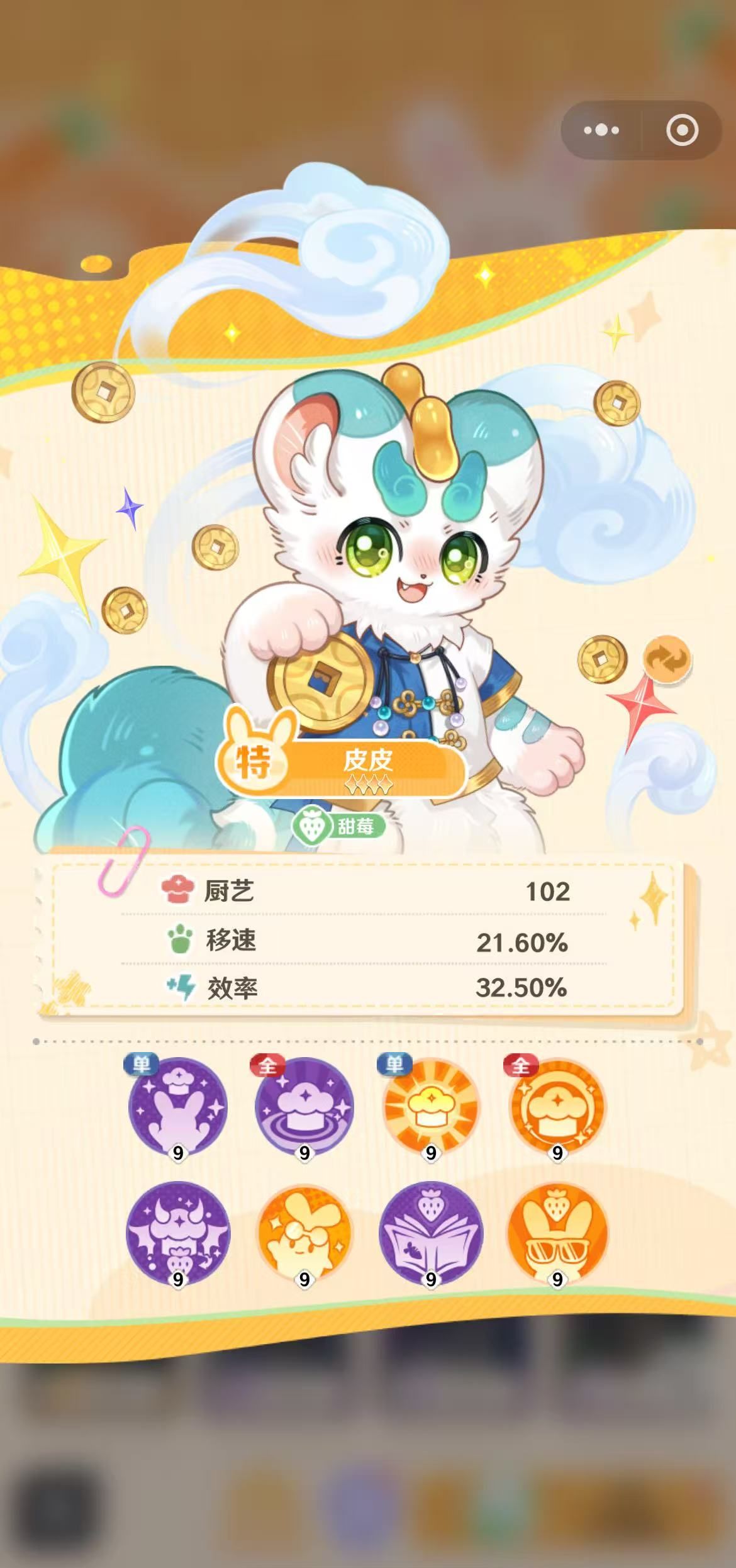 皮皮的厨艺水平也很高,竟然可以达到102,只要尝过他做的饭的顾客都会赞不绝口。在店铺的每一个区域中,移动的速度都会很快,能够在最短的时间乘上顾客们所需要的菜品和饮料,这些都是赢得顾客好评的一要环节。可爱的皮皮将会对每一个工作时间非常负责任,是一个很勤快的员工,这也决定了他的工作效率能够达到32.5%