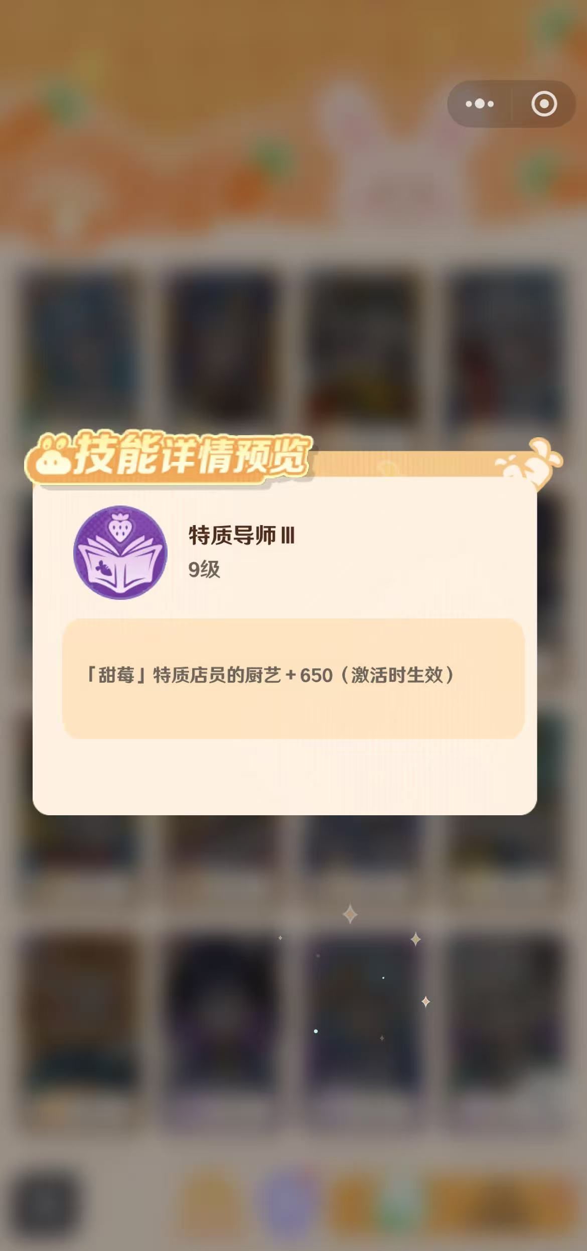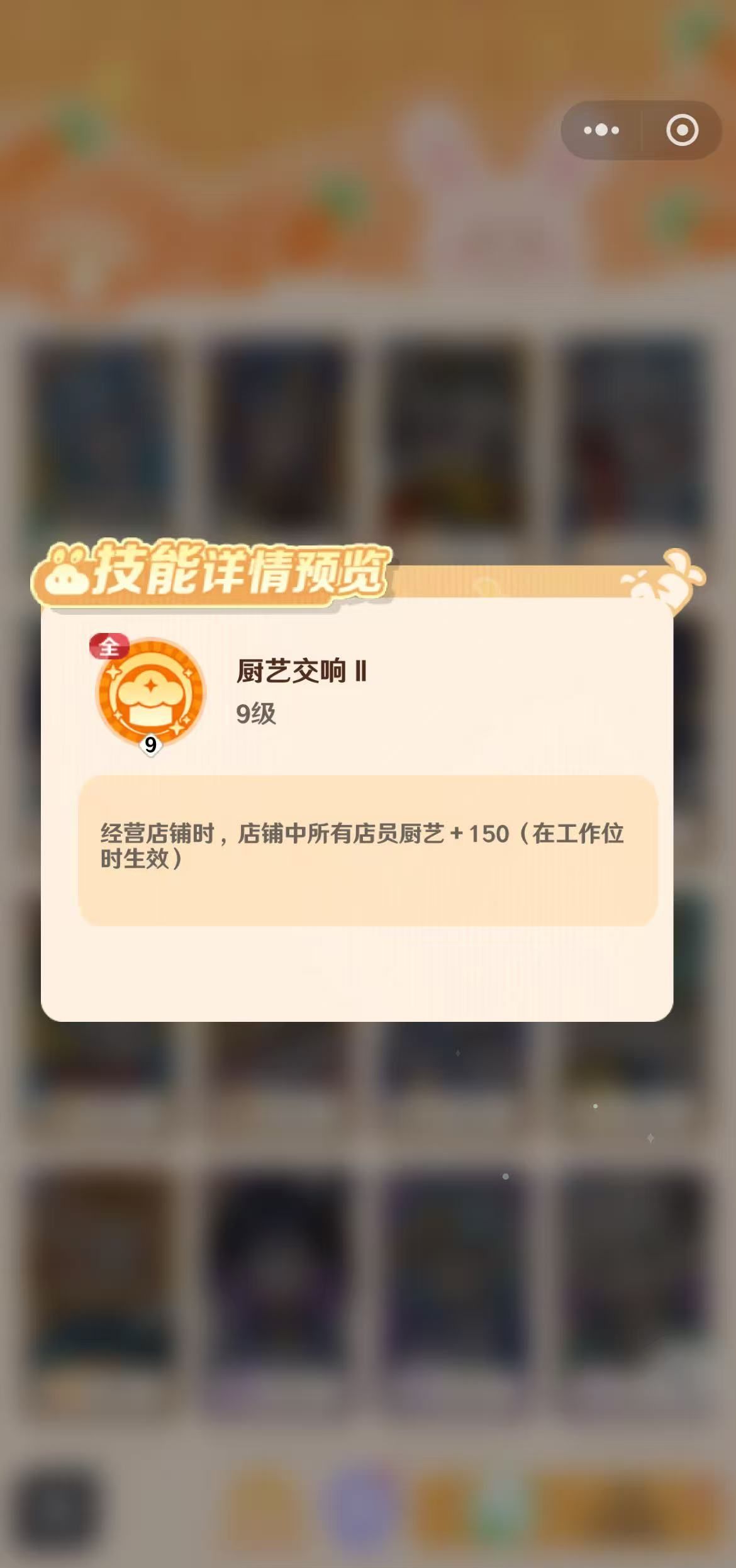 还有一个全体性的技能就是厨艺交响,店铺中所有店员的厨艺都增加150,店铺非常忙碌的时候,可以立即派遣皮皮上阵,带动店铺中的店员们以最大效率参与到工作环节中去。像美食仙人学习还能额外获得食谱秘料6.5%,多多学习才能够让自己变成美食学霸,在厨艺界更能够鼎鼎有名,等级越高时能够解锁的星技能就会越多,各项属性值也会增加不少。
