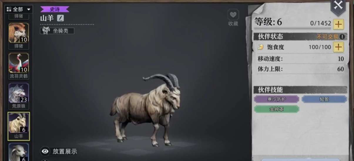 还有就是比较出色的山羊,山羊本身的助益是为玩家们增加获取石头的速度,在凿石这一方面是比较出色的,也同样是和野猪一样是对物资的进行获取,石头一般在游戏中获取的需求量较大,并且在制作工具的时候都需要石头,所以山羊也是一个不错的宠物,但获取山羊必须要前往雪山,获取有一定的难度,除去雪山本身的危机寒冷天气以外,还有需要篝火将冰封山羊的冰块进行融化,雪原附近本身拥有大量的危险生物,小编更推荐小伙伴们一同前行。