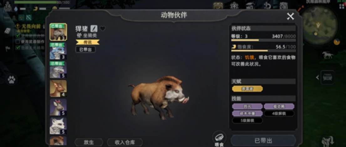 然后玩家们需要物资的可以看一下野猪,野猪本身可以为玩家们提供砍树的辅助作用,可以说野猪这一类都是可以作为专为砍树的宠物,能够让玩家们大大提高对于木材资源的收取速度,要知道木材对于建设和生存是非常重要的,想要囤积资源,千万不能忽略这个宠物,并且黑猪也同样具有碎木的技能,具体情况还是要看玩家们对于某一种宠物的喜爱,以及对技能的需要程度。