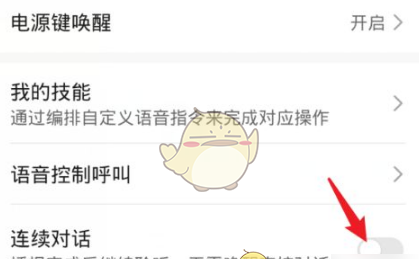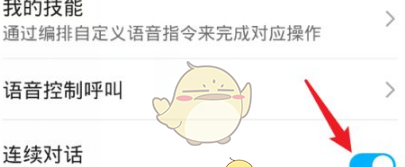 3、在语音助手设置界面,点击连续对话后方的开关。