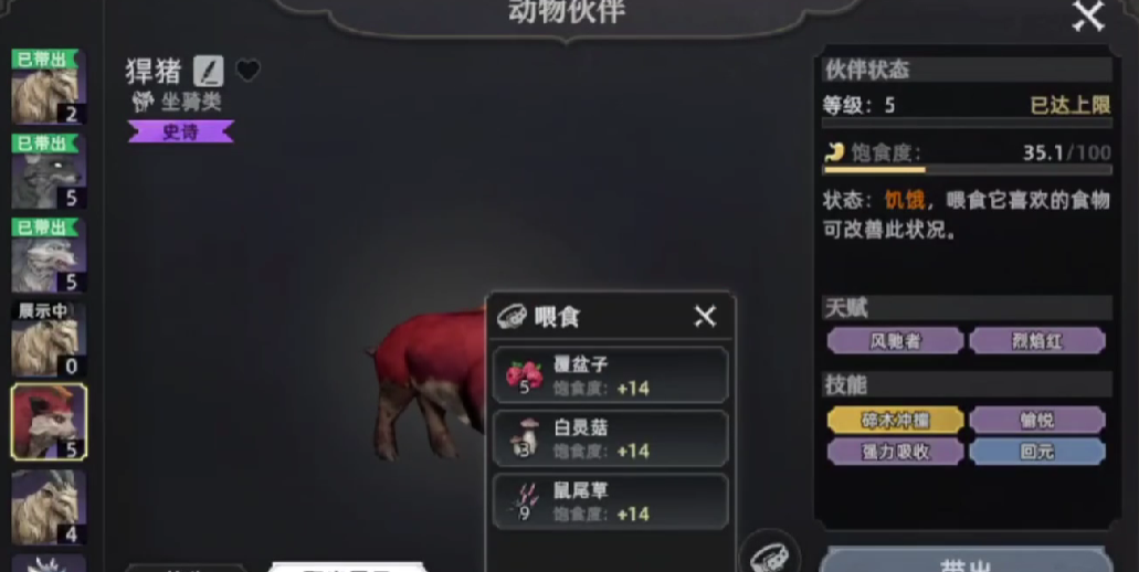 玩家在驯服野猪的时候也需要注意,有些野猪会变异,一旦变异之后,他的实力肯定会变得更加的强壮。另外玩家在骑野猪的时候要装上鞍具。在技能方面的话,野猪其实具备冲撞技能跟战斗辅助技能,不过对于玩家来说骑着野猪去进行资源采集的时候,能够快速的获取矿石,因为它能够冲撞岩体,另外为了能够保证效率的时候,玩家在选择骑野猪时进行资源采集,也可以轮换作业,避免出现过度疲劳的状态。