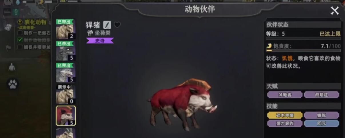 玩家选择骑野猪,之前在游戏地图当中要找到野猪,其中棕鬃野猪是比较常见的一种野猪方式,当然这种野猪其实是可以驯化的,简单来说就是玩家如果想要骑野猪的话,就需要寻找这种野猪。玩家想要找到这类野猪,需要在平原或者是在丛林边缘,在寻找野猪的时候可以听声音来辨认。对于新手玩家来说,在寻找棕鬃野猪的时候,要找那种幼年的野猪之后将其驯服。玩家成功的捕捉了棕鬃野猪之后,在驯服的时候先对它的血量进行控制,另外玩家要躲避他的冲撞,毕竟在驯服的过程当中,野猪会持续性的移动,而玩家所需要做的就是尽可能的避免被野猪正面冲撞。从而导致自身受到伤害。