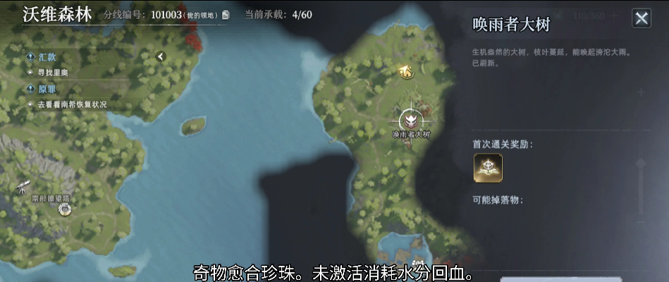 玩家想要获得愈和珍珠的时候需要先找到大boss,此时玩家要打开荒原曙光的地图,在地图中找到唤雨者大树。而在这样的情况下,玩家的等级最好要先满足20级以上。另外玩家所需要准备的武器为火属性的武器,在战斗之前,玩家要准备水分补给品,这样的话才能够在没有激活的时候,满足回血的需求,当玩家一切都准备就绪之后,此时就可以直接来到唤雨者大树所在的位置。