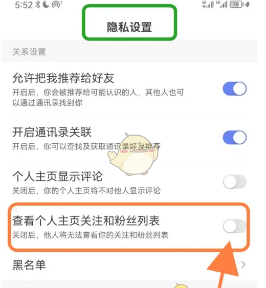 3、在隐私设置界面中,把【查看个人主页关注和粉丝列表】功能后的开关,关闭即可。