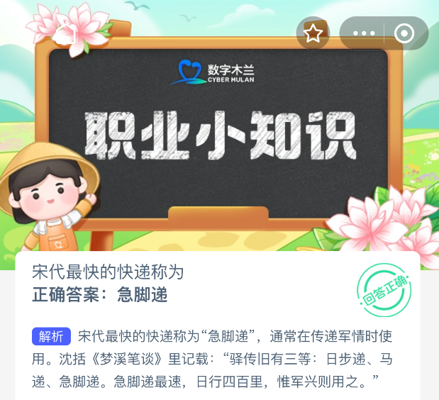 宋代最快的快递称为?【蚂蚁新村每日一题】2025年10月14日题目已发布!坚持答题,积累木兰币,即可加速小镇建设。答对本题,立即可享“产速+3/时”的加速奖励!今天正确答案是【急脚递】。宋代最快的快递称为“急脚递”,通常在传递军情时使用。