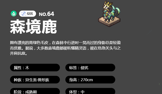 从外形来看确实很吸引人,有青绿色的毛皮,一看就比较亮眼,关键是还可以听懂精灵语。在危急的时刻就可以站在我们的边上,成为我们的左膀右臂,这互动感还是比较出色的。另外还会有清晰的属性,中猪就直接放在一生类的兽形足内,身高是270厘米,属于一个中型体型。目前正处于成熟期阶段,定位还是比较明确的,不过需要注意的是它并没有一个成长路线。所以在培养的时候,重点就是放在属性搭配,还有技能上面那先来看一下技能方面的优势。