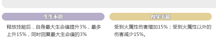 除了主动技能之外,被动技能也是比较有优势性的,例如生生不息,一看就很能打,在释放技能之后就可以有效提升3%的最大生命值,最多还可以叠加15%,续航能力可以直接拉满。厚实毛皮需要注意搭配,虽然受到火属性就会额外的增加15%的伤害。但除了火属性伤害之外,其他的全部都会减少15%的伤害。只要可以避开火系敌人,那生存的能力就可以直接飙升。亢奋这就是一个团队神技,一旦在放技能之后,队伍中的角色全部都会增加50%的伤害。唯一需要注意的是不能够叠加。