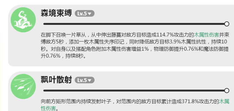森境束缚在释放的时候就可以直接召唤草丛,藤蔓在缠绕之后就可以给敌方造成114.7%的攻击力。并且还可以束缚对方将近5秒的时间,同时会叠加一个木属性的失序印记,更绝的是就可以降低敌方3.9%的木属性抗性。不过与此同时也会给自己还有我方的队友增加1%的伤害加成,在8秒的时间内还是很有优势性的。飘叶散射这就是一个范围性的伤害利器会朝着前方矩形区域去持续的发射叶子。累击就可以直接打出371.8%的攻击力木属性伤害,在清理小怪或者是打群体boss时真的很好用。