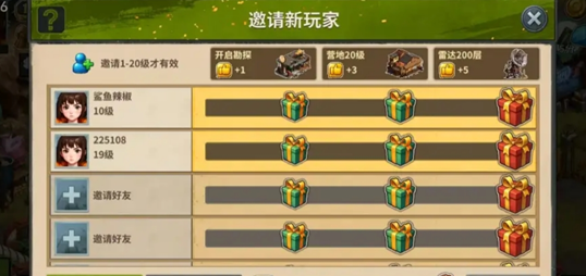 只能在20级之前填别人的邀请码,只要你超过20级就不填了,另外里面的奖励需要你邀请的小伙伴最少到25级,勘探是25级才能开的,营地20级