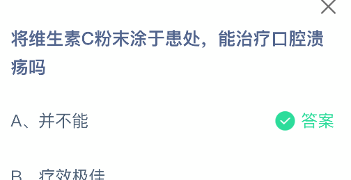 以上就是将维生素C粉末涂于患处,能治疗口腔溃疡吗,支付宝蚂蚁庄园2025年10月16日答案最新,更多精彩内容,请点击关注更新!