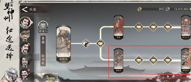 在仕途的选择上,每一条路线其实都可以给到曹操的角色碎片,这些碎片就可以用来升阶。但是兵种的路线一定要挑选下路的精锐骑兵,还有重骑兵。选择这一条线就可以让曹操拥有六格移动力,还可以迅速的提升机动性,关键是走位是比较灵活的,可以轻松的覆盖更多的队友,还可以迅速的提升辅助效率。