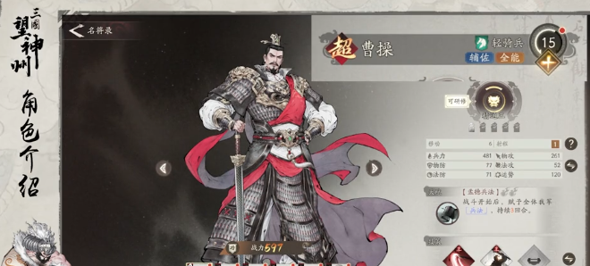 在众多的角色中,曹操还是比较有优势性的。技能组全部都是增伤效果,还有属性增益效果是一个比较强的辅助角色。而且有一些关卡还会强制的要他,所以一定要把曹操当成主力去培养。在资源比较少的时候,就可以把曹操当成副c来使用,技能方面建议选择短歌行,还有魏武挥鞭。魏武挥鞭这一个技能是比较实用的,就可以直接带到毕业,记得别忘记还需要升升级。在30级到60级之后,曹操就彻底的转型变成了辅助,这个时候毕业技能组也就定下来了,里面会有魏武挥鞭,还有天下归心。
