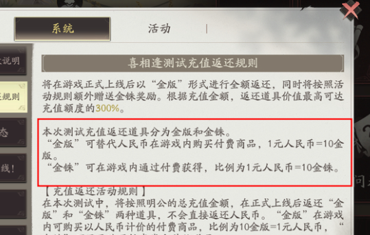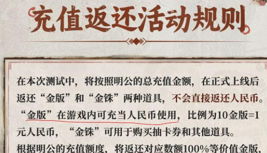 首先你需要明确这一次充值返的并不是人民币,而是两种道具。金铢就是其中的一种,到底是如何来计算的呢?那就是一块钱等于10个金版,一块钱等于10个金铢。金版用处还是比较大的,在进入到正式服之后就可以直接当做人民币,例如可以购买月卡,可以购买礼包,只要是标着人民币价格的商品全部都可以用来去兑换,相当于全额返还你的充值本金。金铢主要的作用那就是用来购买抽卡券,又或者是游戏中的道具,是为了帮助你囤抽卡资源。