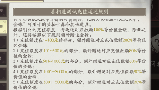 核心的返还规则是无论你充多少钱,第1次充值就可以拿到100%的金版,例如充100元就可以获得1000元,充198元就可以返还1980,这是固定的,主要的关键就是额外赠送的金铢,这一部分就是根据充值的分档来算,不同的档位比例会有所区别。例如当你在充值一元到100元的时候,就会额外的赠送200%的金铢,而如果是充值101元到500元,那返还的就是80%。如果是501元到1000元,那就是返还60%,可如果是超过5001元就不会额外的赠送。