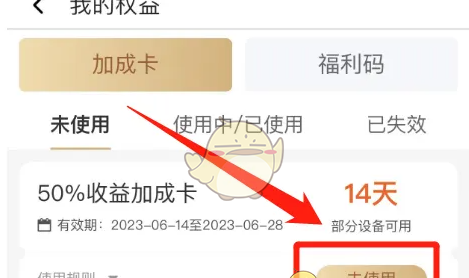 2、在“我的权益”窗口点击收益加成卡的“去使用”按钮。