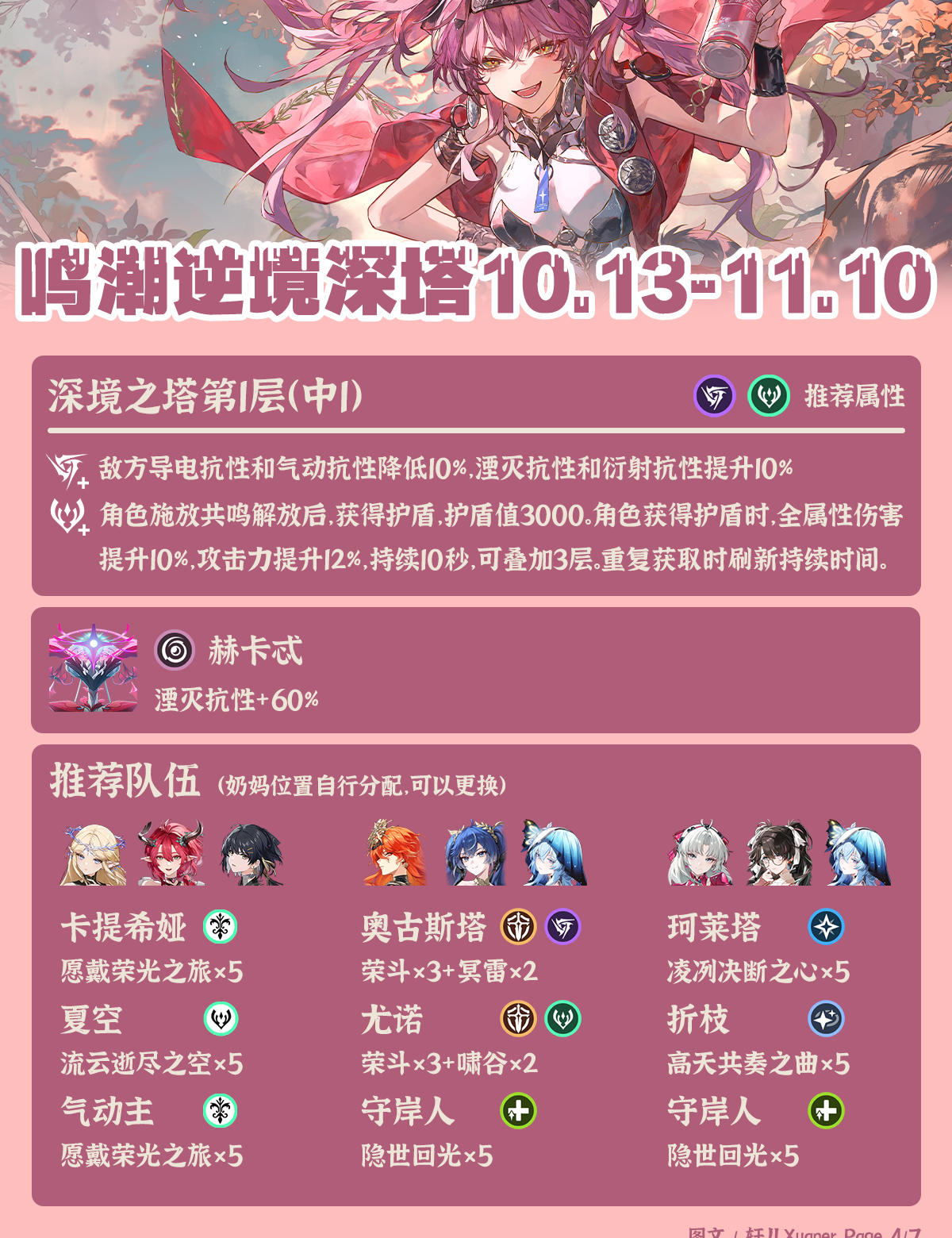 鸣潮最新深塔推荐阵容一览,玩家“轩儿Xuaner”的鸣潮最新深塔推荐阵容出炉,日月、卡提、弗坎仍是主力,赞菲可出场,嘉贝莉娜需等仇远。有需要的玩家可自行查看参考。