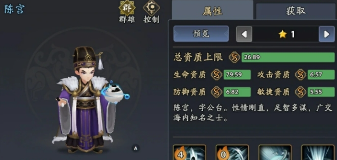 陈宫 + 甄姬 + 张春华 + 廖化 + 貂蝉可以把这一些角色搭配在一起,这一套阵容的控制链相对还是比较稳定的,陈宫并不是一开始就可以招募,而是需要玩家等级提升到199级,然后才可以招募。总资质的上限就是26.89在控制武将中属性还算是很不错的。重点就是技能机制大招就可以针对敌方全体,然后造成48%的攻击力,还会有20%的概率,直接获得三个回合的迟滞,同时还会有20%的命中加成,可以轻松的抵御敌方的闪避,保证控场并不会落空。被动技能更加的厉害。