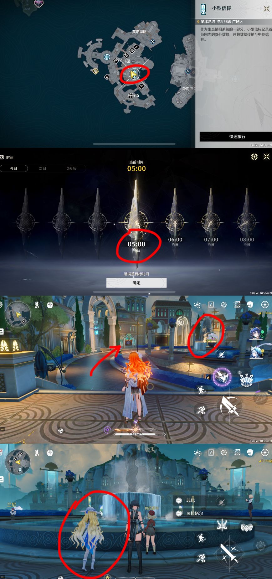 调整时间至:次日早上5:00,小地图-北方向,沿着面前的小路走到右边的喷泉面前就能看到菲比,与之对话即可获得此成就。