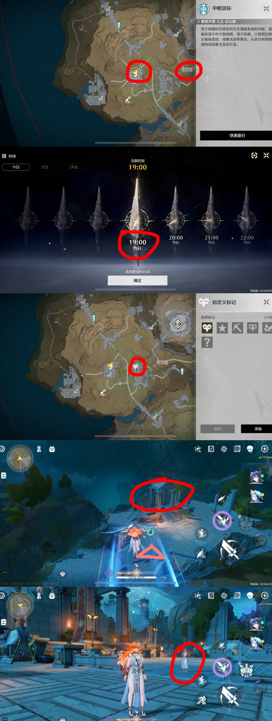 传送至:七丘地图左半部分的巨石原-中枢信标,调整时间至:次日晚上19:00(要到下图中标记位置的地方)小地图-东偏南一点点