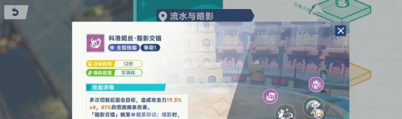 在讲完秘纹,玩家也可以看一下每一个角色自身所带的普通技能。不管是哪一个角色技能也会分成4个类型,普通攻击并没有什么好特殊的,就是基础性的输出并不需要去等cd,很适合用来补充伤害。主动技能还有援护技能就是核心,例如科洛尼斯的主控技能就可以冷却12秒,而且还不会消耗能量,就可以多次切割针对敌方的目标。造成4段攻击力,大概19.3%的伤害,还有41%的范围暗系伤害。