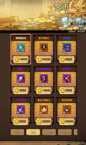 2、金币商城:必买--强化石,突破石,异界挑战卷轴,宠物果(钱不够可以暂缓)。其他可以按需购买,每日刷新数量还是很多的。