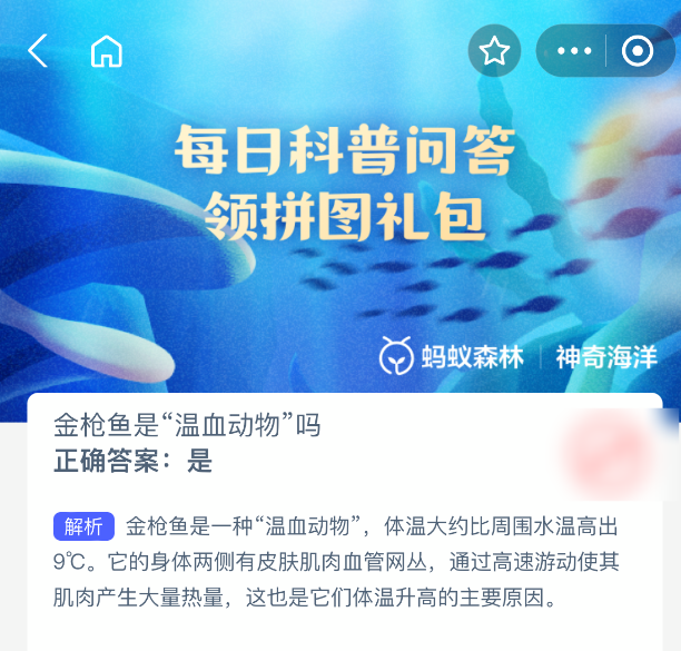 金枪鱼是“温血动物”吗?【神奇海洋】10月16日新题目已开答!正确答案现已公布,点击领取拼图,一起为修复海洋生态贡献力量!今日正确答案是:【是】,金枪鱼是一种“温血动物”,体温大约比周围水温高出9℃。