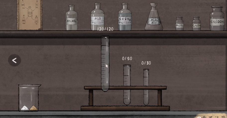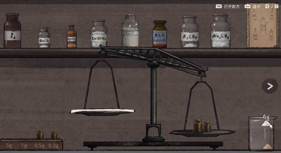 在第三个案件中,玩家会进入到工厂,在工厂这里角色意外身亡,但有其他的证据显示角色是被其他成员杀害的,为了可以找到真正的凶手,玩家需要在场景里不断搜索,同时还需要去配置一些可以显示出血迹的试剂,这时候玩家可以打开试剂台,可以看到在左侧会有砝码,上面还会有很多不同的药品,可以在右侧放置最小的砝码,然后按照游戏里提示的顺序,把药品放到左侧,然后按照要求的顺序倒入进去,所有的固体放置进去之后,就可以用试管调配液体,按照特定的重量调配完成之后,就可以获得显示出血迹的试剂。