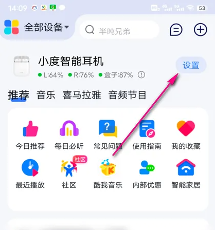 1、在小度软件主界面,点击设备右侧的设置按钮。