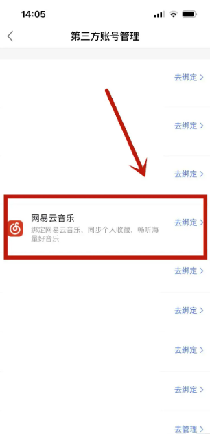 3、找到网易云音乐后点击去绑定即可。