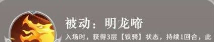入场时,获得3层【铁骑】状态,持续1回合,此后每回合开始有66%概率重新获得此效果。