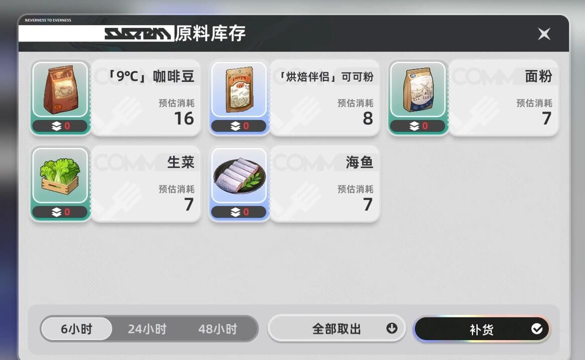 然后就是运营,运营最重要的就是材料采购,而且还要注意平衡仓库,点击左下角供应链按钮,选24小时配送服务,虽加收5%配送费,但避免手动采购的麻烦。咖啡豆和可可粉保持3天库存,薄荷和面粉控制1天用量,这两种食材保质期较短。自动制作咖啡基础售价四块五,加薄荷后可到五块一,但是最高最高也不要到五块五,会导致顾客投诉。