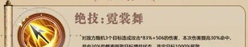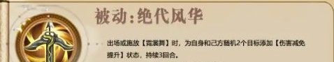 出场或施放【霓裳舞]时,为自身和己方随机2个目标添加【伤害减免提升】状态,持续3回合。【伤害减免提升】:伤害减免提升28.6%