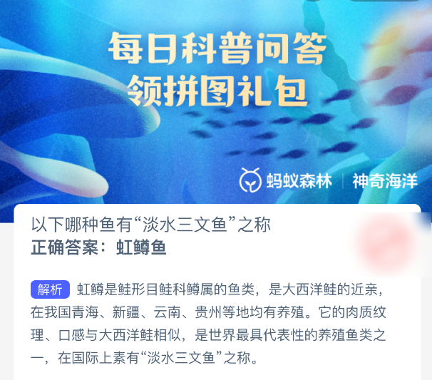 以上就是以下哪种鱼有“淡水三文鱼”之称?神奇海洋今天答案最新2025年10月17日分享,更多相关攻略内容,请点击关注更新!