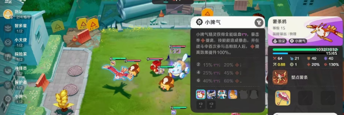 自身的特性小脾气,使得带有此特性的精灵可以获得全能吸血效果和暴击率提升效果,技能可以打出暴击,并且在战斗中首次参与击败敌人后提高效果,直接提升100%。因为小脾气特性的精灵数量比较多,所以凑齐羁绊非常简单,尽量达到六羁绊,此时可以获得40%的吸血效果和60%的暴击率提升,对于所有参战的输出精灵来说都是很明显的加成。