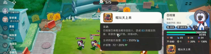 百戏猩自身的技能是帽从天上来,主动释放之后召唤出魔法帽攻击敌人,造成魔法伤害同时获得护盾,持续4秒钟。主动技能伤害量是350%魔法属性,护盾量是20%生命值。从技能就可以看出,这是一个中规中矩的前排精灵,并没有其他的特点,在战斗前期因为自身费率比较低,可很快地召唤出来,是前期出场比较多的一个。后续如果不想走变化流,那么百戏猩出场几率就会低一些。