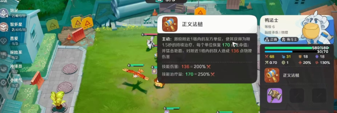 鸭法士的元理比较独特,它是属于正确元理,角斗士特性。自身的技能正义法锤,可以对附近一格之内的友方单位进行激励,使其获得持续1.5秒的持续治疗效果。并且使用锤子猛击地面,对附近一格内的敌人造成物理伤害。无论是技能伤害还是技能治疗量,都和自身的物攻属性相关。自身的正确原理,可以带来30%的攻击力提升效果。