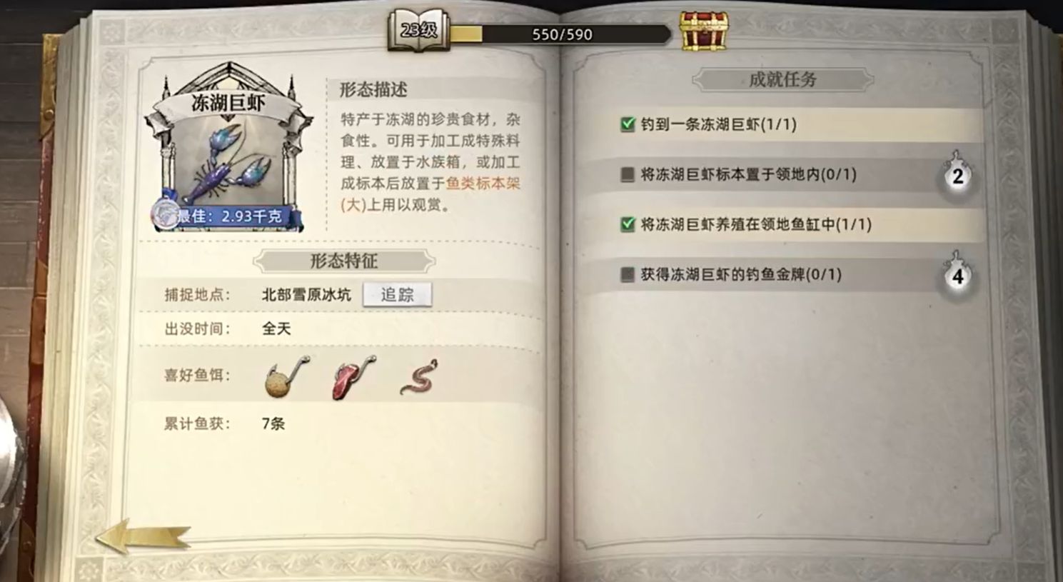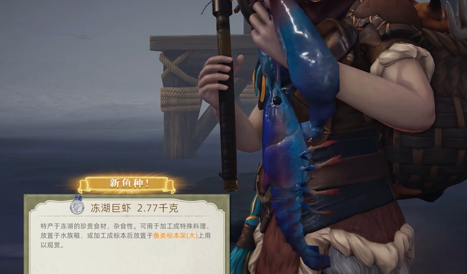 将冰坑挖出来后,各位再准备一个能持续为自己提供热源的设施,例如篝火、石制烤盘等,并把它放在离冰坑较近的位置方便自己取暖,随后就能开始进行钓鱼了。冻虾是不挑鱼饵的渔获,所以玩家可用任何一种鱼饵来掉它,且它全天都会出现,人们可随时过来钓,无需在固定时段前来。等玩家将鱼钩甩入冰坑后,冻虾会很快咬钩,玩家需及时咬杆并进行溜鱼,注意要按提示来进行操作,失误时会提高鱼线的张力导致它断掉。等鱼放弃挣扎后,各位就可将鱼竿提起来,并获取上边的渔获。