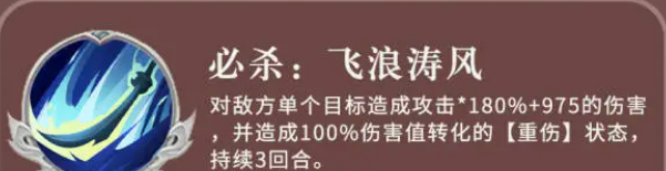 所以在需要攻击的时候周泰是可以针对敌方输出进行主要攻击的,他在技能上面有一个必杀技,叫做飞浪涛风,使用这个技能的时候,是针对敌方的一个目标进行攻击,这里的攻击百分比达到了180%,然后加上975点的固定伤害,此时还会有百分之百的伤害可以进行转化,转化的能力就是一个重伤的状态施加给敌人,在敌人身上重伤的状态会影响后面三个回合的掉血效果,那么他在被动能力上面还有一个赤胆丹心,这个技能就是周泰在被敌方击杀并导致死亡的时候,有百分百的概率会重生。
