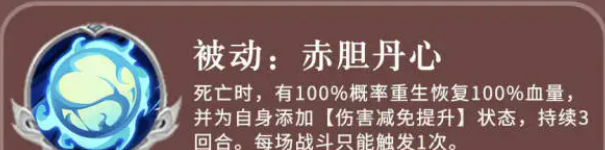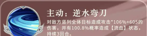 当然,重生的效果是每一场战斗里面最多只能使用一次的,此时在重生了之后,他自身的血量数值是会达到百分百恢复的,所以是又重新回到了巅峰状态当中,此时,他给自身添加的增益效果是一个伤害减免提升的效果,所以,如果是重生后的状态进行输出的话,是非常有优势的,当然这个效果也是可以持续3个回合给他带来足够争议的,那另外一个主动技能叫做逆水弯刀,这个技能是针对一个数列的敌人目标进行攻击,所以也算做一个群体的攻击效果,带来的百分比是106点的攻击伤害,加上固定的605点伤害数值,并且此时的话,也会有100%的概率可以造成流血的状态。