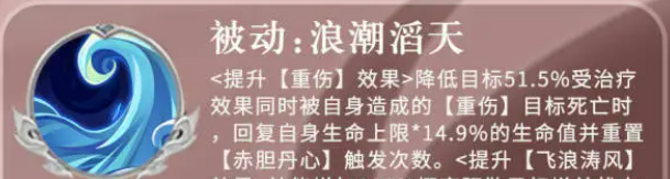 流血状态跟上面的一个重伤状态其实是类似的效果,都是可以持续让敌人进行掉血的,所以他的各个增益之间都是可以联合使用的,他的最后一个被动叫做浪潮滔天,使用的时候会跟他带来的重生状态有关,如果是施加重伤状态给敌人的话,那么这个被动触发就会提升重伤的效果,此时会降低目标51%点的受治疗效果,同时他自身造成的重伤,如果给敌人造成死亡的情况下,他还可以给周泰自身带来生命恢复的效果,这里会根据他生命数值的14%点上限数值带来生命值恢复,并且会重置赤胆丹心的触发次数,那么后期再提升了这个技能的情况下,他自然还会得到更高的触发概率,这个效果还是非常有用的,特别是在敌方控制比较多的情况下,他用这个技能可以让敌方的一些增益效果全部不生效。