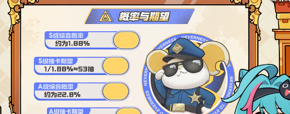 这个时候s级角色还有稀有道具的出货几率就会提升。直到抽取到s级角色,才可以恢复基础的概率。在触发变格之后,棋盘上的每6个格子全部都会有一个s级的角色格。那测算下来基本上是70抽之后20抽以内必定可以获得s级的角色。此时s级角色的出货几率大概是18.9%左右。 A级角色以及武器概率大约是22.8%,而且每抽取10次就会额外的赠送一个a级道具。算下来包含当期所有限定的s级角色,那出货的几率起码可以达到53抽。