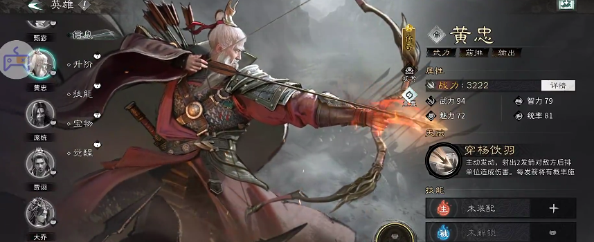 最后为大家推荐的就是黄忠了,黄忠这个蜀国武将其实很多玩家在玩输出的时候都用过他,他虽然也是前排的角色,但是他绝对定位是在输出上面的,抗伤的能力不算强,但是他的远程输出能力绝对是比其他的角色都要强的,因为在很多玩家需要玩弓箭手带队的情况下,黄忠他就是最完美的一个选择,不同于其他依赖群伤技能带来输出的武将,他可以直接攻击敌方的一些关键武将,黄忠更擅长在战斗里面进行点名,点名的是情况下他如果有大招还可以直接将点名的这个目标带走,后期如果大家将黄忠培养起来的话,那么他的攻击以及暴击都会得到很强的倍率提升,所以他在后期的强度上面会更强一些。