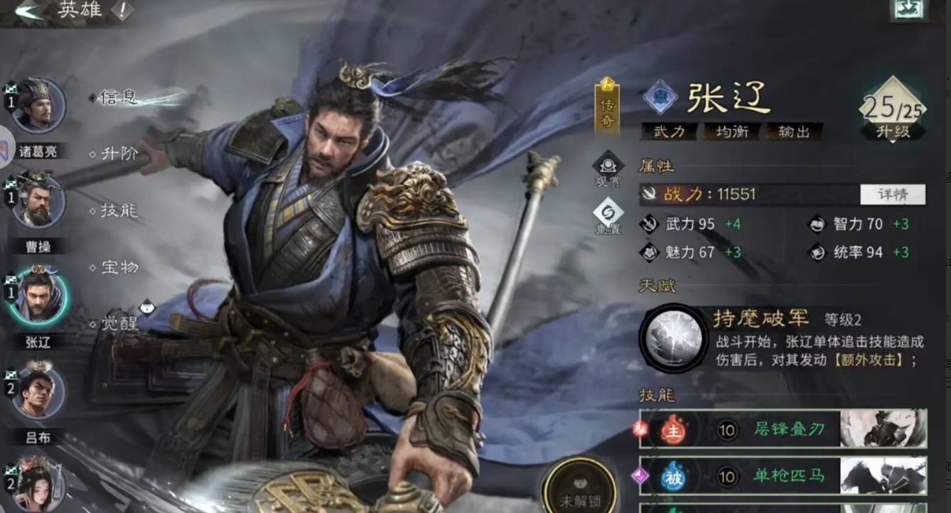第二个为大家推荐的武将叫做张辽,张辽的特点就是可以让追击技能触发完之后再追加一次输出,所以算作是在自己的技能使用完之后,还可以额外带来两次行动,虽然这个行动是被动的追击效果,但是一次连招他就可以连打两次,所以这里的机制让张辽短时间之内打出来的伤害可以跟很多的输出武将对比,特别是大家如果需要打一些后排脆皮的时候,那么张辽是绝对可以用上的一个武将,而且他这一击的输出量也不小,建议大家是推图的时候可以上一个张辽。